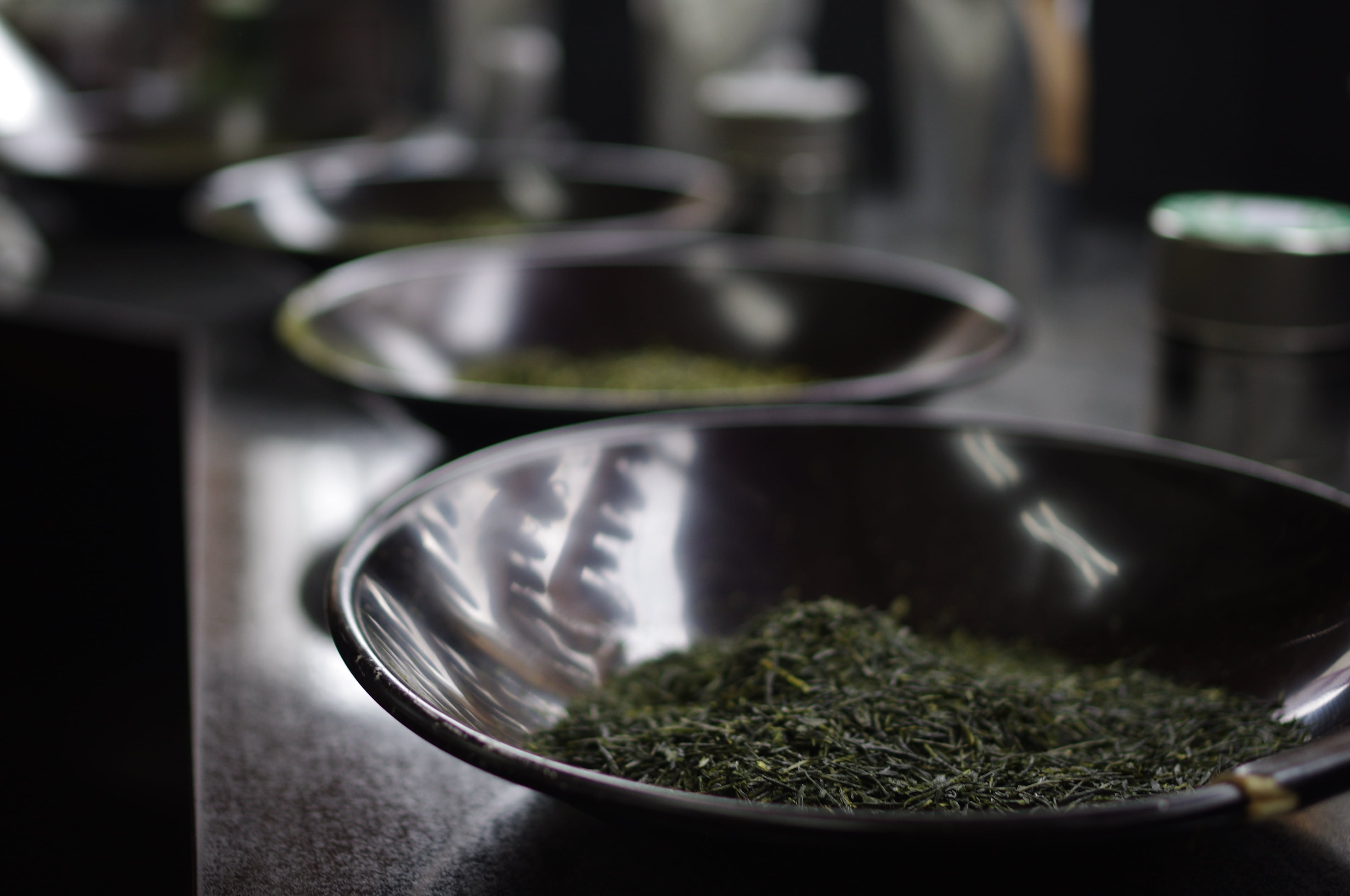 ①茶商(茶問屋)がお茶を審査する場「拝見場」に入り、数種類のお茶を拝見(審査)します。